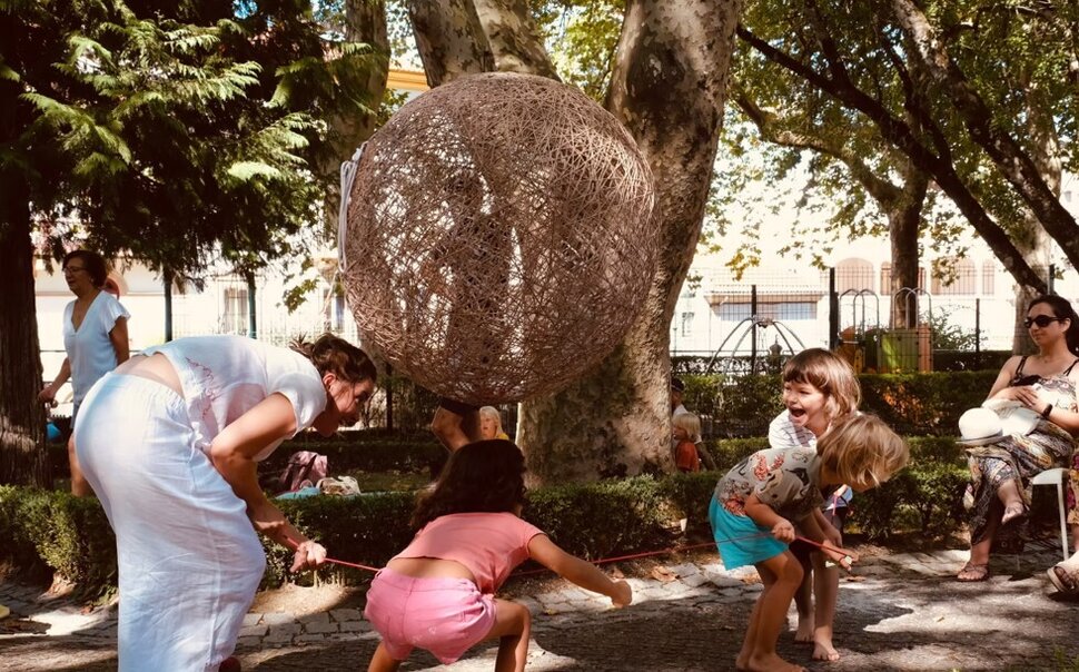 in do é um quarteto para três corpos-bola e um corpo humano. É uma dança-viagem que conversa com o vento, com a inclinação da rua, com o coração de quem passa ou vem ao encontro. Pessoas de muitas idades juntas. Pelo caminho aparecem fios que tecem histórias, fios que destapam mistérios escondidos e esquecidos e guardados em cantos e brechas.